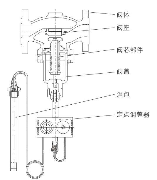 當(dāng)被控對象溫度低于設(shè)定溫度時,溫包內(nèi)液體收縮,作用在執(zhí)行器推桿上的力減小,閥芯部件在彈簧力的作用下使閥門打開,增加蒸汽和熱油等加熱介質(zhì)的流量,使被控對象溫度上升,直到被控對象溫度到了設(shè)定值時,閥關(guān)閉,閥關(guān)閉后,被控對象溫度下降,閥又打開,加熱介質(zhì)又進(jìn)入熱交換器,又使溫度上升,這樣使被控溫度為恒定值。閥門開度大小與被控對象實際溫度和設(shè)定溫度的差值有關(guān)。