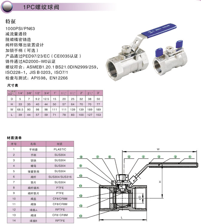 1PC螺紋球閥簡(jiǎn)單描述:減流量通徑,雙內(nèi)牙設(shè)計(jì),脫蠟精密鑄造閥體,設(shè)有閥桿防爆出裝置,主要用于截?cái)嗷蚪油ü苈分械慕橘|(zhì),結(jié)構(gòu)緊湊,密封可靠,結(jié)構(gòu)簡(jiǎn)單,維修方便,經(jīng)濟(jì)實(shí)惠,全開或全閉時(shí),球體和閥座的密封面與介質(zhì)隔離,介質(zhì)通過時(shí),不會(huì)引起閥門密封面的侵蝕,易于操作和維修