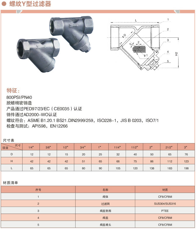 螺紋Y型過濾器簡單描述:產(chǎn)品采用螺紋連接,脫蠟精密鑄造工藝,使用維護方便,一般通水網(wǎng)為18~30目,通氣網(wǎng)為10~100目,通油網(wǎng)為100~480目,產(chǎn)品作用是過濾介質(zhì)中的機械雜質(zhì),可以對污水中的鐵銹、沙粒、液體中少量固體顆粒等進行過濾以保護設備管道上的配件免受磨損和堵塞,可保護設備的正常工作。