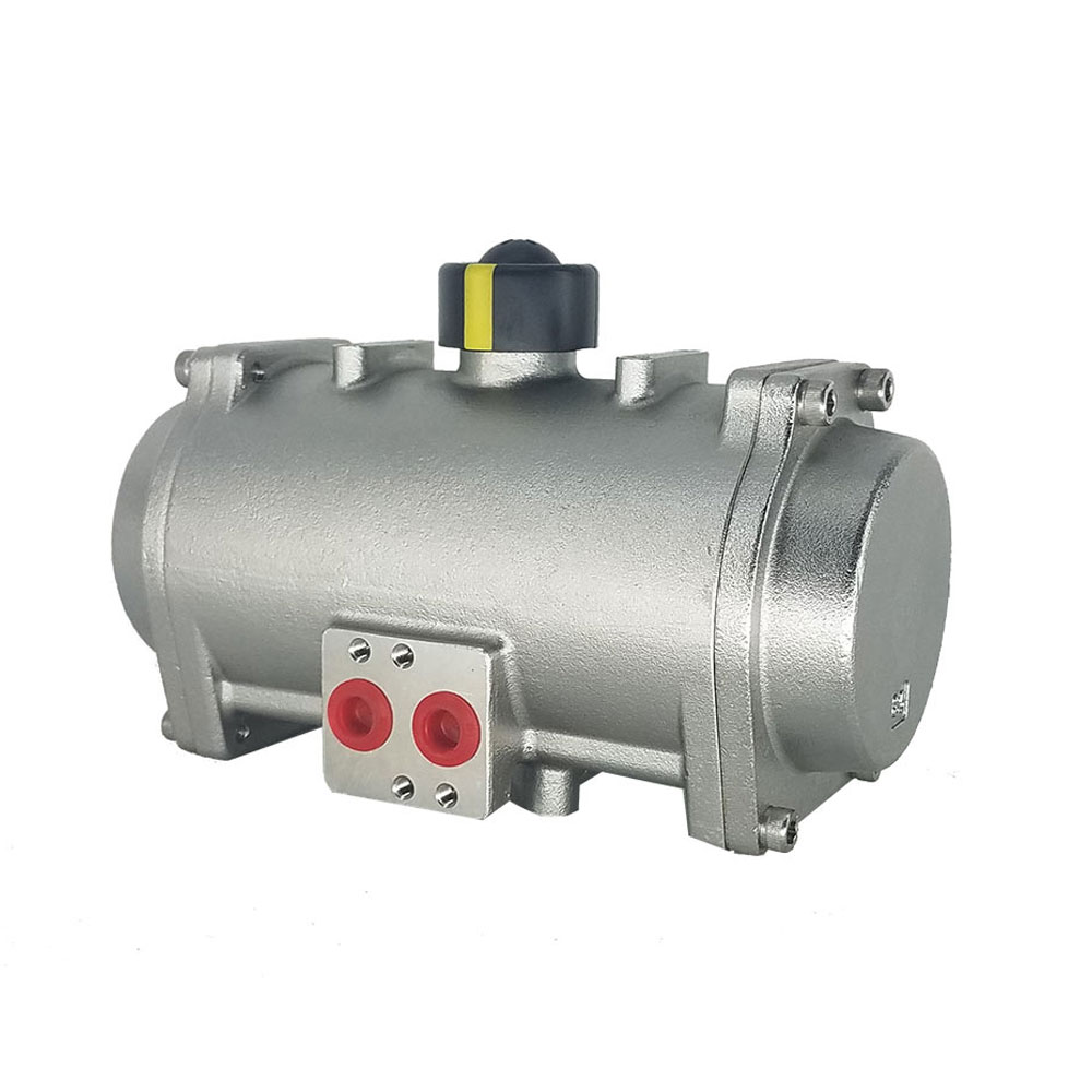 不銹鋼JRPP(雙作用)/(單作用)系列氣動執(zhí)行器,該產(chǎn)品所有零部件均采用CF8或CF8M不銹鋼材質(zhì),可在高腐蝕性環(huán)境下長期使用。F4密封不但具有良好的耐腐蝕性,更具良好的耐磨性,可大大提高該系列執(zhí)行器的使用壽命,是普通執(zhí)行器的三到五倍。該產(chǎn)品采用齒輪齒條傳動結(jié)構(gòu),以及加寬導(dǎo)向四氟滑片設(shè)計,大大提高輸出扭矩的輸出效率。雙向角度高達(dá)±10°的可調(diào)范圍,可滿足各類回轉(zhuǎn)型閥門的需要。底部連接符合ISO5211標(biāo)準(zhǔn),可直接安裝在球閥、蝶閥、旋塞閥等頂部。執(zhí)行器頂部及側(cè)面電磁閥接口符合mamur norm標(biāo)準(zhǔn),使得電磁閥、三聯(lián)件、限位開關(guān)等控制附件安裝更為容易。 頂部安裝尺寸符合NAMUR標(biāo)準(zhǔn),氣源接口尺寸符合NAMUR標(biāo)準(zhǔn),無需另裝轉(zhuǎn)接板,底部安裝孔尺寸符合ISO5211、DIN3337標(biāo)準(zhǔn),方便安裝電磁閥及回訊器等附件.此款氣動執(zhí)行器高強(qiáng)耐磨損,耐腐蝕,密封性能優(yōu)越,耐高低溫,開關(guān)次數(shù)高達(dá)100萬次以上,使用壽命長,適合于抗腐蝕要求極高的工況條件,完全可以替代同類進(jìn)口產(chǎn)品,尤其適用于海上鉆井平臺,造船,制藥和食品衛(wèi)生級等領(lǐng)域.